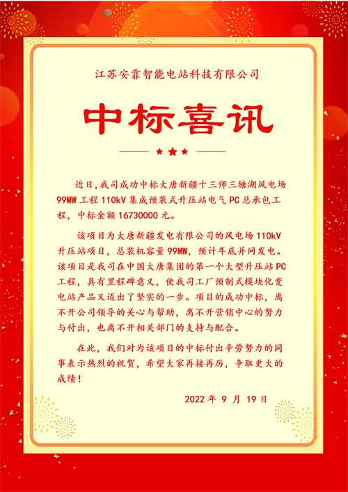 近日,我司成功中標大唐新疆十三師三塘湖風電場99MW工程110kV集成預裝式升壓站電氣PC總承包工程,中標金額16730000元。